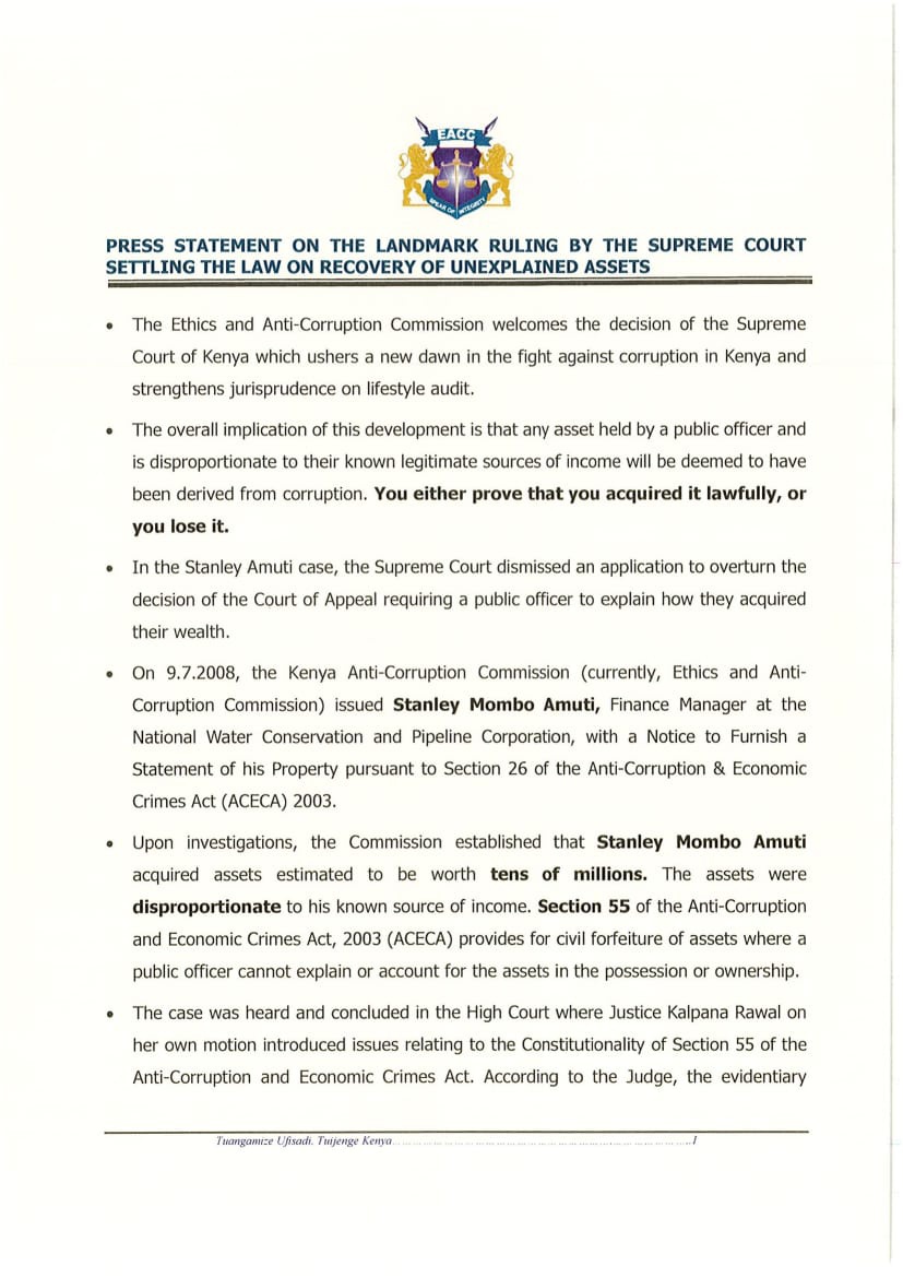 The supreme court of Kenya has now ruled that if you can't explain the source of your wealth, you lose it.